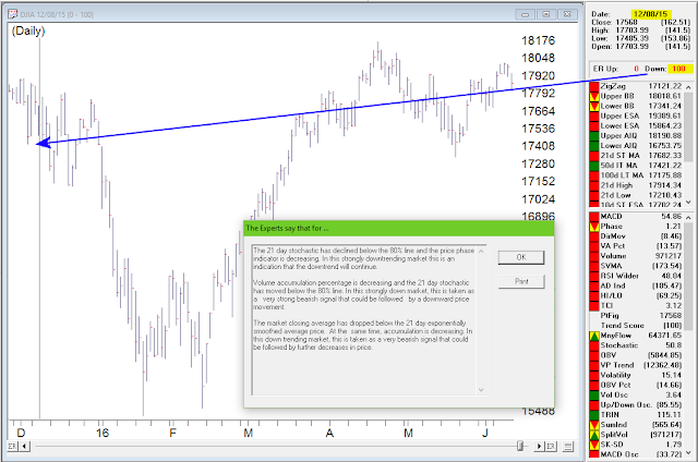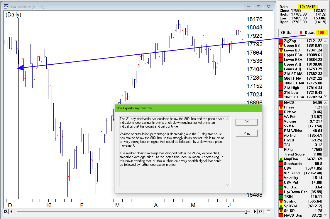 The image below is taken from the AIQ Reports Daily Market Log. This report pulls elements from various parts of TradingExpert. You’ll notice the 0-100 down signal on DJIA on 6/10/2016. Just below that is WAL 5-95. This is the Up/Down Signal Ratio from the Weighted Action List (WAL) in this case using SP500 stocks. This 5-95 confirms that 95% of the SP500 stocks have down signals according to the stock expert system.