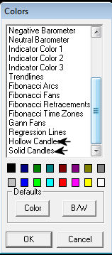 Hollow and solid candles can now be assigned their own colors. Under Chart, Settings, Colors.