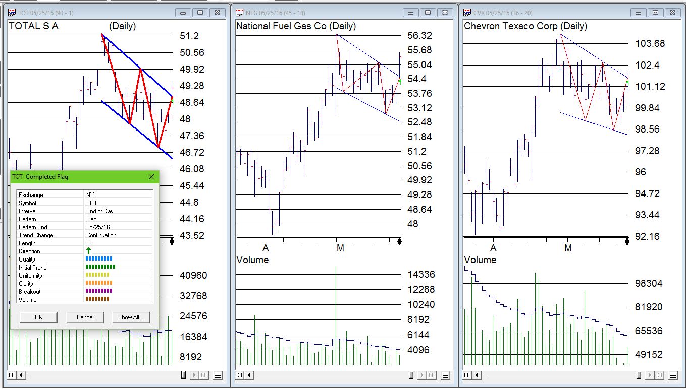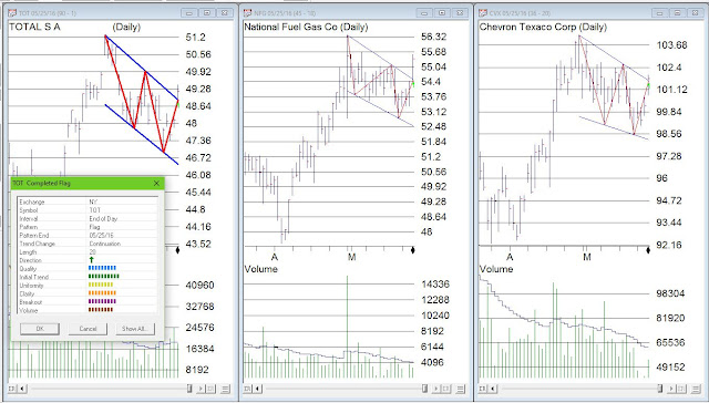 Our Chart pattern Recognition tool had a wealth of gasoline related stocks have breakouts yesterday. The classic flag breakout on good volume could be seen on CVX, NFG and TOT.