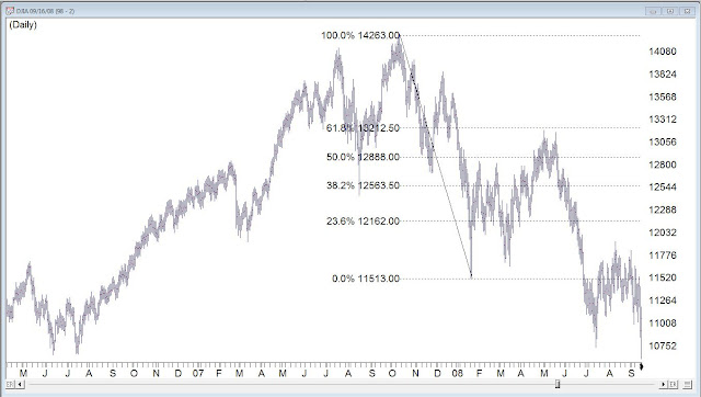Finally a study of the 2008 bear market reveals an interesting retracement from the initial fall in prices. The market fell from the peak of the 2007 at around 14279 to the low on 1/22/08 around 11508. Subsequent rally was a classic Fibonacci retracement to 61.8% level before falling again in May 2008. After that failed turnaround the markets fully entered bear territory.