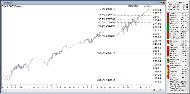 Economics aside, the current correction, and yes we are still in corrective territory can be seen in this SPX monthly chart. The Fibonacci retracement drawn from the low of the February 2018 correction to the recent high shows we’re at or past the 38.2% level. The next significant level is at 50% level of around 2729.