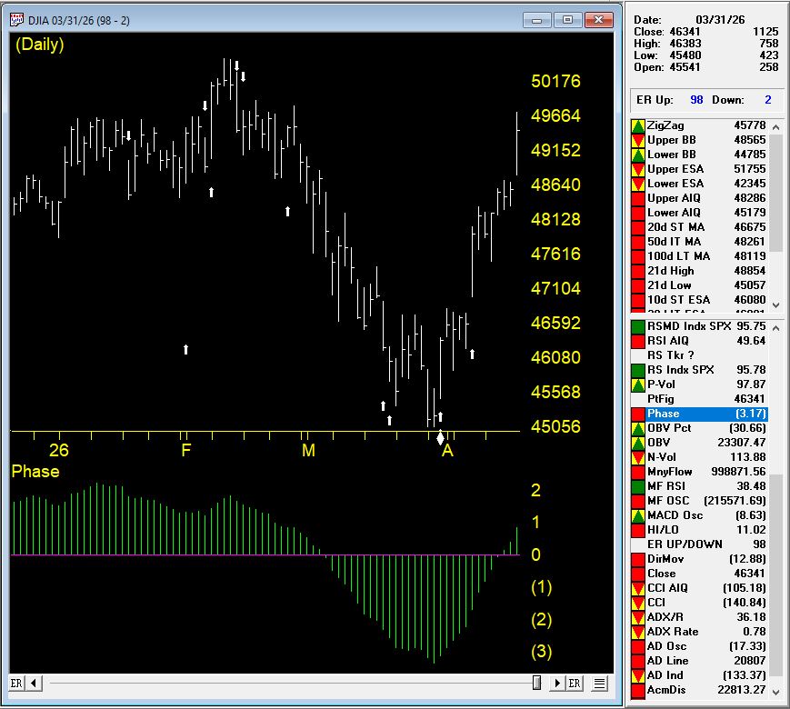 March 31 produced the most powerful single-day reading in the sequence — an Expert Rating of 98 — Up, arriving with Phase already turned upward. The individual timing rules that fired during this sequence tell a story that every AIQ trader should understand, because they illustrate precisely how the system thinks.